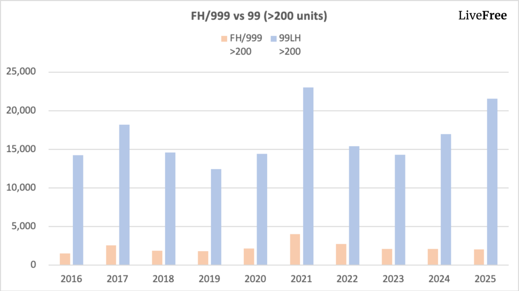 Large 99-year leasehold condos easily record 5 to 10 times more transactions than comparable freehold condos.