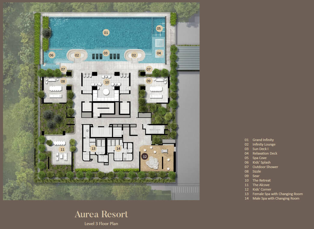 Grand infinity (25m lap pool), The Retreat (Clubhouse), Sizzle (Grill Pavilion), Sear (Teppanyaki Pavilion), The Alcove (Recreation Area), Kids’ Splash (Children’s pool), Kids’ Corner (Playground), The Dining Room (Function Room), Lounge Cove (Outdoor Lounge), Viewing Point (Recreation Area), Rock Garden (Recreation Area), Hammock Garden (Recreation Area), Sky Infinity (22m Lap Pool), Sky Gym, Serenity Deck (Yoga Area), The Boulder (Bouldering Wall), Sky Fitness Deck (Fitness Area)