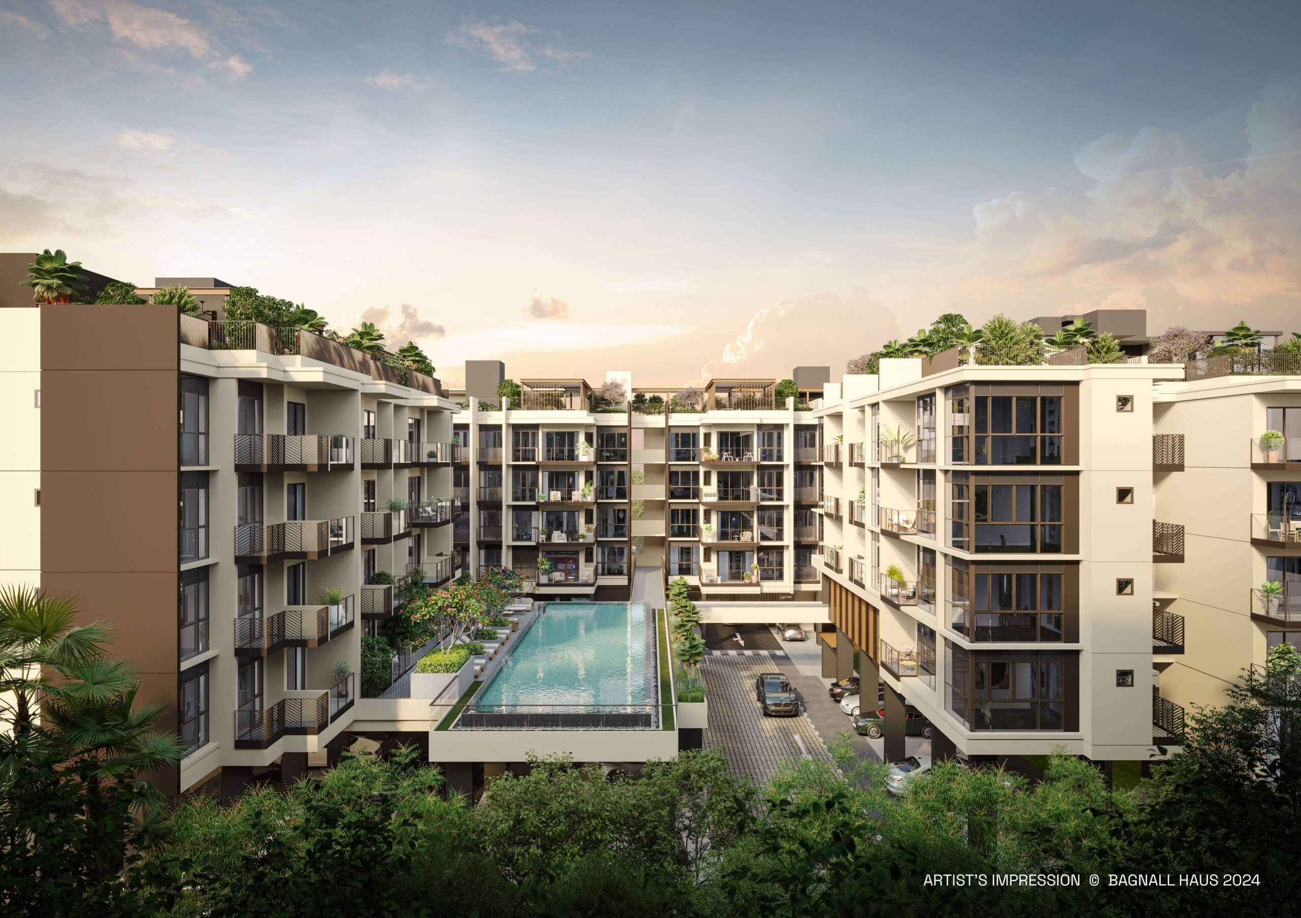 Designed around the concept of “Heritage Living Redefined,” Bagnall Haus blends warm textures, chevron-inspired motifs and lush landscaping to reflect the charm and cultural narratives of the East. The development features a beautifully elevated inner courtyard with a 25m lap pool, sun decks, lounge cabanas and greenery, while the rooftop “Haus Canopy” offers panoramic lifestyle spaces, including a gym, clubhouse, alfresco dining pavilions, sky swings, a yoga yard and micro-parks. This combination of heritage-inspired aesthetics and modern design creates an elegant, tranquil escape from city life.