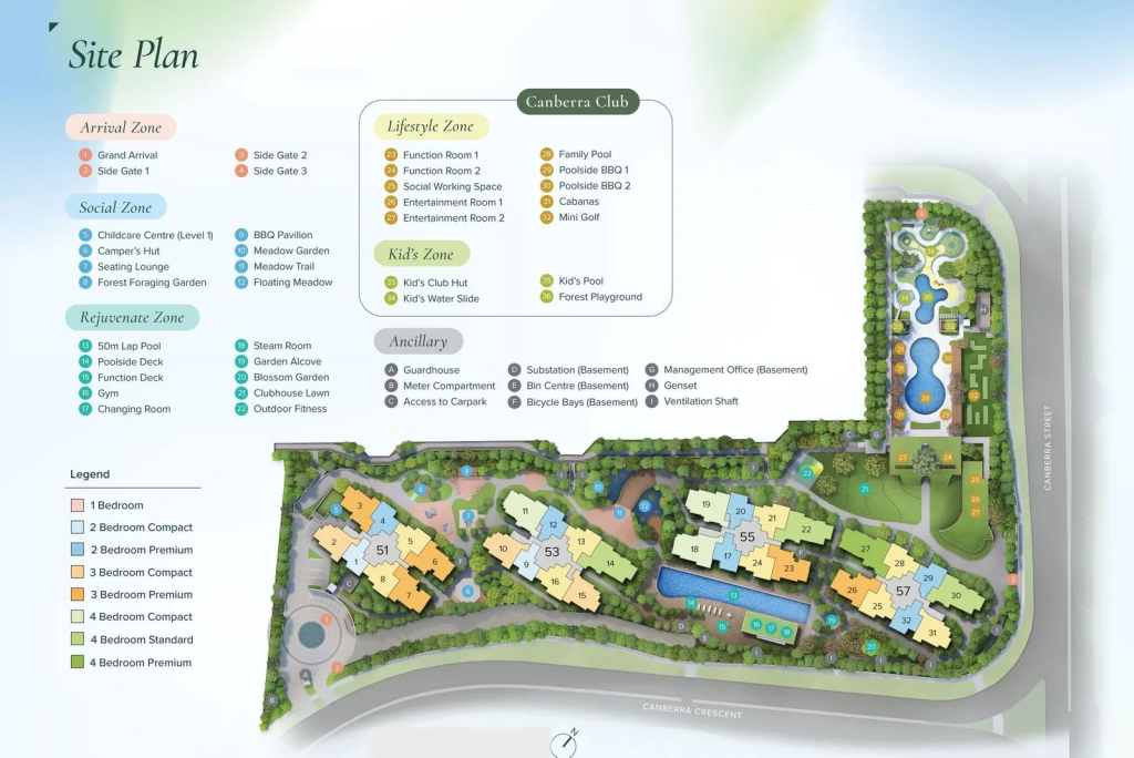 There are 13 different unit types in Canberra Crescent Residences. 1 Bedroom at 409 sqft, 2 Bedroom Compact at 570 sqft, 2 Bedroom Premium at 667 sqft, 3 Bedroom Compact from 797 to 883 sqft, 3 Bedroom Premium at 990 sqft, 4 Bedroom Compact from 1,163 to 1,173 sqft, 4 Bedroom Standard at 1,216 sqft, and 4 Bedroom Premium at 1,324 sqft respectively.