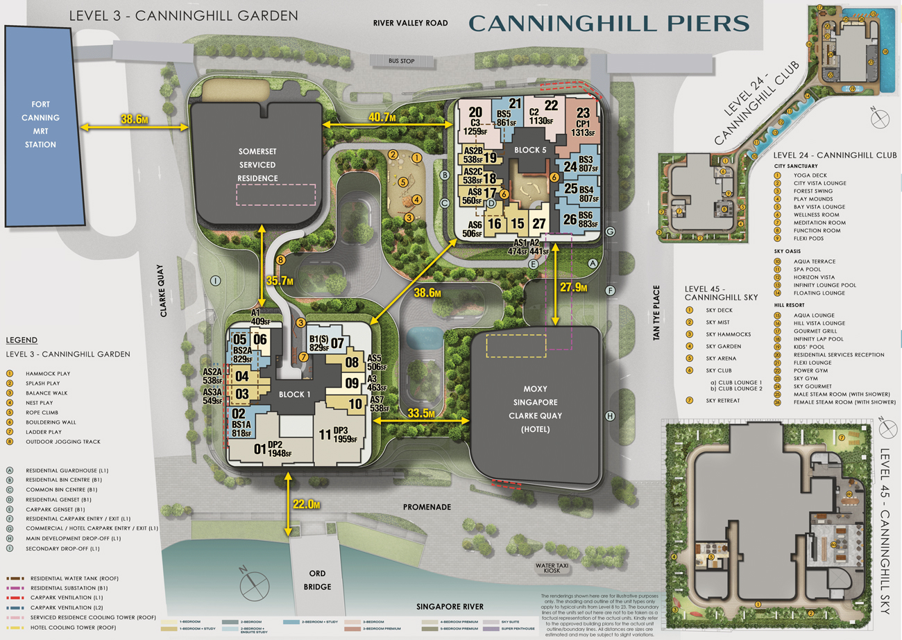 L3 Canninghill Garden: Hammock Play, Splash Play, Balance Walk, Nest Play, Rope Climb, Bouldering Wall, Ladder Play, Outdoor Jogging Track L24 Canninghill Club: Aqua Terrace, Spa Pool, Horizon Vista, Infinity Lounge Pool, Floating Lounge, Aqua Lounge, Hill Vista Lounge, Gourmet Grill, Infinity Lap Pool, Kids’ Pool, Residential Services Reception, Flexi Lounge, Power Gym, Sky Gym, Sky Gourmet, Male Steam Room (With Steam), Female Steam Room (With Shower), Yoga Deck, City Vista Lounge, Forest Swing, Play Mounds, Bay Vista Lounge, Wellness Room, Meditation Room, Function Room, Flexi Pods L45 Canninghill Sky: Sky Deck, Sky Mist, Sky Hammocks, Sky Garden, Sky Arena, Sky Club (Club Lounge 1 & Club Lounge 2), Sky Retreat