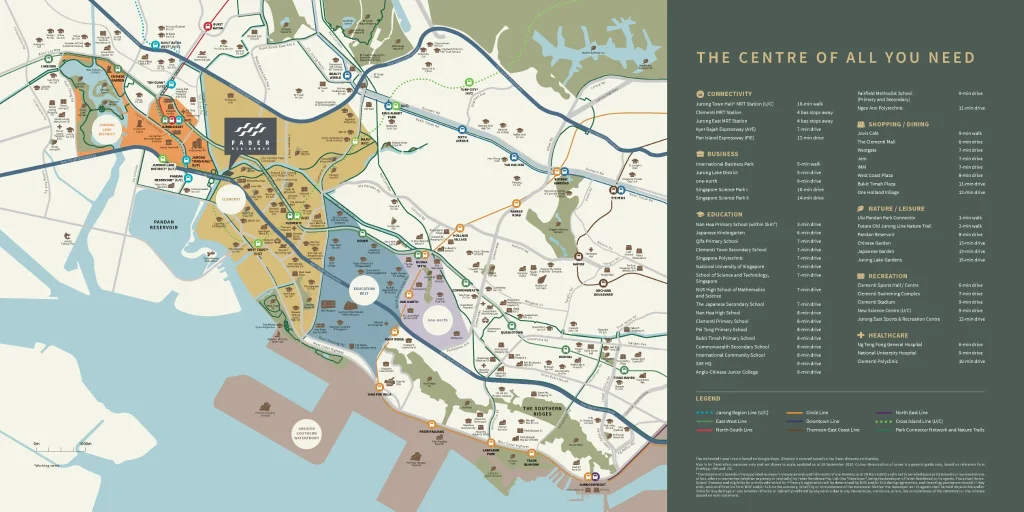 Positioned within one of Singapore’s most important transit corridors, Faber Residence enjoys excellent connectivity via the PIE, AYE, West Coast Highway and the Clementi MRT interchange (EW23/CR17), placing residents within easy reach of the CBD, Jurong Lake District, one-north and major employment clusters such as NUS, NUH, Science Park and Mapletree Business City. Families benefit from a strong education network, with Nan Hua Primary within 1km, and multiple primary, secondary and tertiary institutions — including Ngee Ann Polytechnic, Singapore Polytechnic and NUS — located nearby.