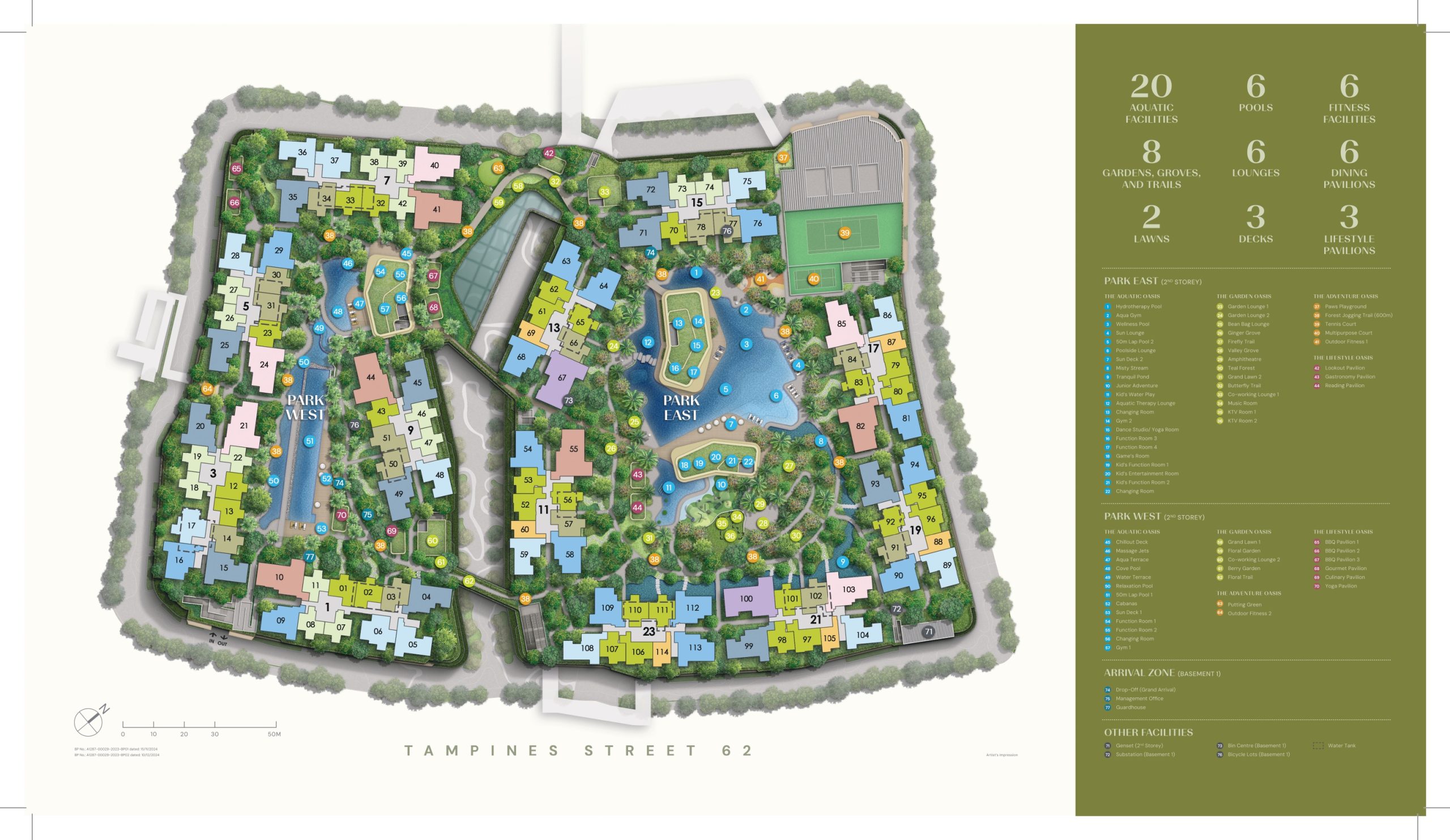 Hydrotherapy Pool, Aqua Gym, Wellness Pool, Sun Lounge, 50m Lap Pool 2, Poolside Lounge, Sun Deck 2, Misty Stream, Tranquil Pond, Junior Adventure, Kid’s Water Play, Aquatic Therapy Lounge, Changing Room, Gym 2, Dance Studio / Yoga Room, Function Room 3, Function Room 4, Games Room, Kid’s Function Room 1, Kid’s Entertainment Room, Kid’s Function Room 2, Changing Room (East), Garden Lounge 1, Garden Lounge 2, Bean Bag Lounge, Ginger Grove, Firefly Trail, Valley Grove, Amphitheatre, Teal Forest, Grand Lawn 2, Butterfly Trail, Co-working Lounge 1, Music Room, KTV Room 1, KTV Room 2, Paws Playground, Forest Jogging Trail (600m), Tennis Court, Multipurpose Court, Outdoor Fitness 1, Lookout Pavilion, Gastronomy Pavilion, Reading Pavilion, Chillout Deck, Massage Jets, Aqua Terrace, Cove Pool, Water Terrace, Relaxation Pool, 50m Lap Pool 1, Cabanas, Sun Deck 1, Function Room 1 (West), Function Room 2 (West), Changing Room (West), Gym 1, Grand Lawn 1, Floral Garden, Co-working Lounge 2, Berry Garden, Floral Trail, Putting Green, Outdoor Fitness 2, BBQ Pavilion 1, BBQ Pavilion 2, BBQ Pavilion 3, Gourmet Pavilion, Culinary Pavilion, Yoga Pavilion