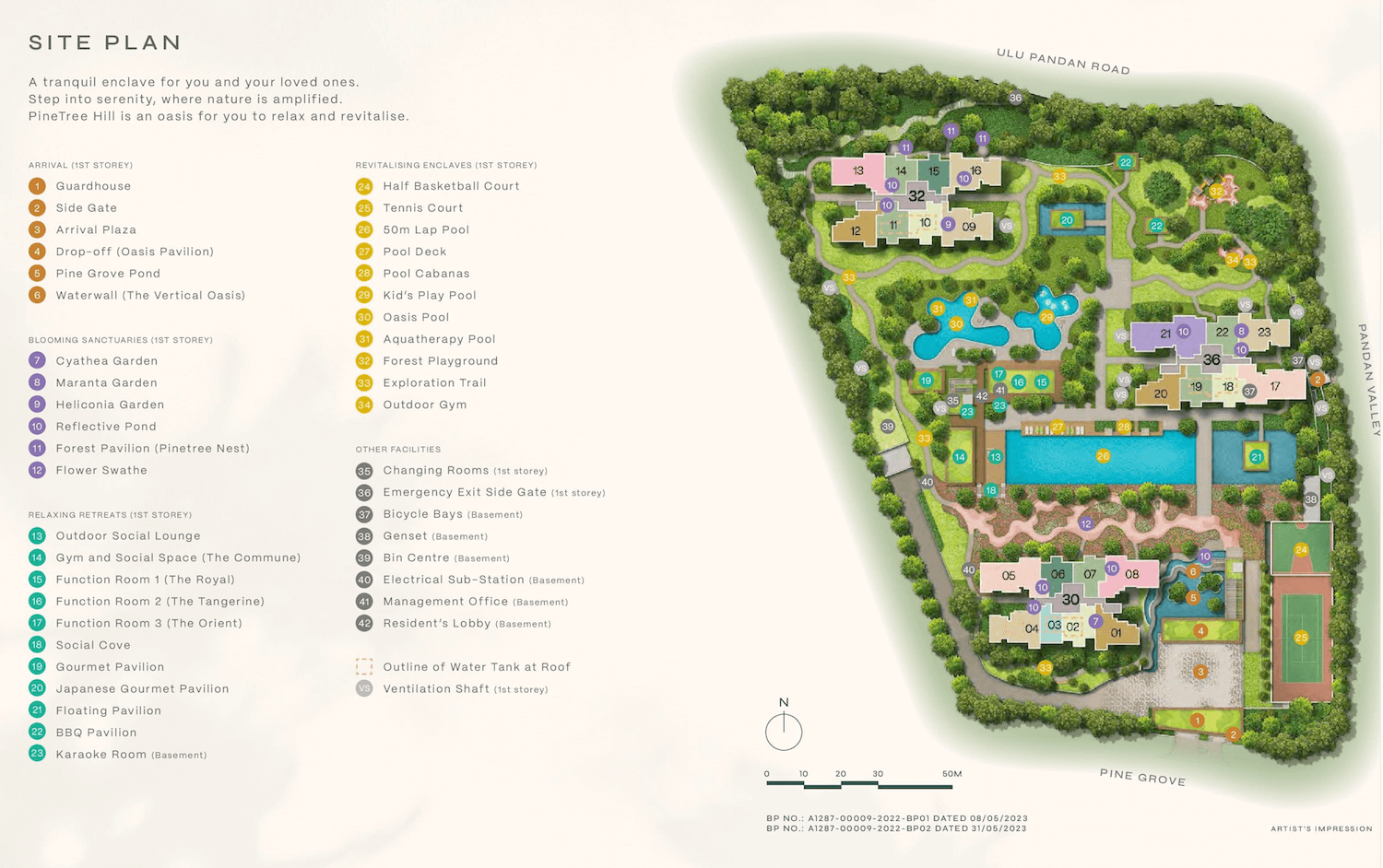 Pine Grove Pond, Waterwall (The Vertical Oasis), Cyathea Garden, Maranta Garden, Heliconia Garden, Reflective Pond, Forest Pavilion (Pinetree Nest), Flower Swathe, Outdoor Social Lounge, Gym and Social Space (The Commune), Function Room 1 (The Royal), Function Room 2 (The Tangerine), Function Room 3 (The Orient), Social Cove, Gourmet Pavilion, Japanese Gourmet Pavilion, Floating Pavilion, BBQ Pavilion, Half Basketball Court, Tennis Court, 50m Lap Pool, Pool Deck, Pool Cabanas, Kid’s Play Pool, Oasis Pool, Aquatherapy Pool, Forest Playground, Exploration Trail, Outdoor Gym, Karaoke Room (Basement)