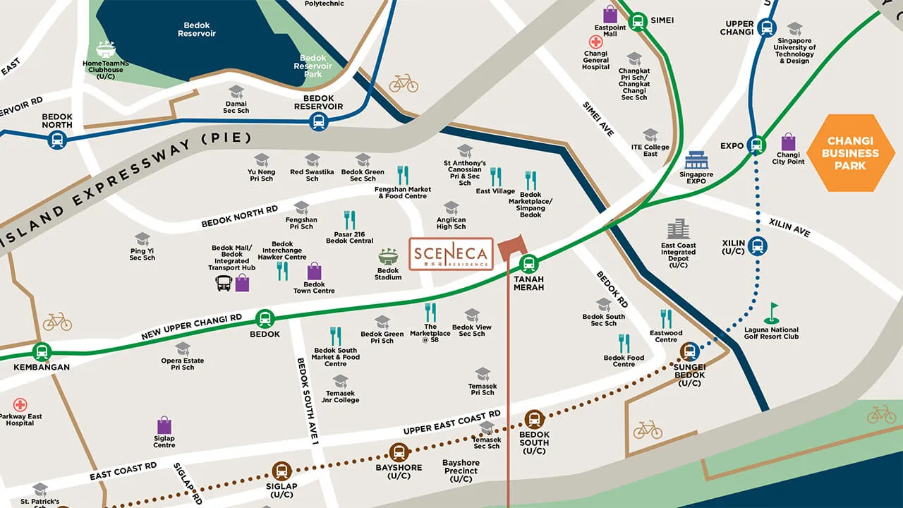 Sceneca Residences is seamlessly connected to Tanah Merah MRT Station, offering unmatched accessibility to the East–West Line and the upcoming Thomson–East Coast Line interchange at Sungei Bedok. This gives residents efficient access to the CBD, Changi Airport, Paya Lebar, and the eastern employment belt.