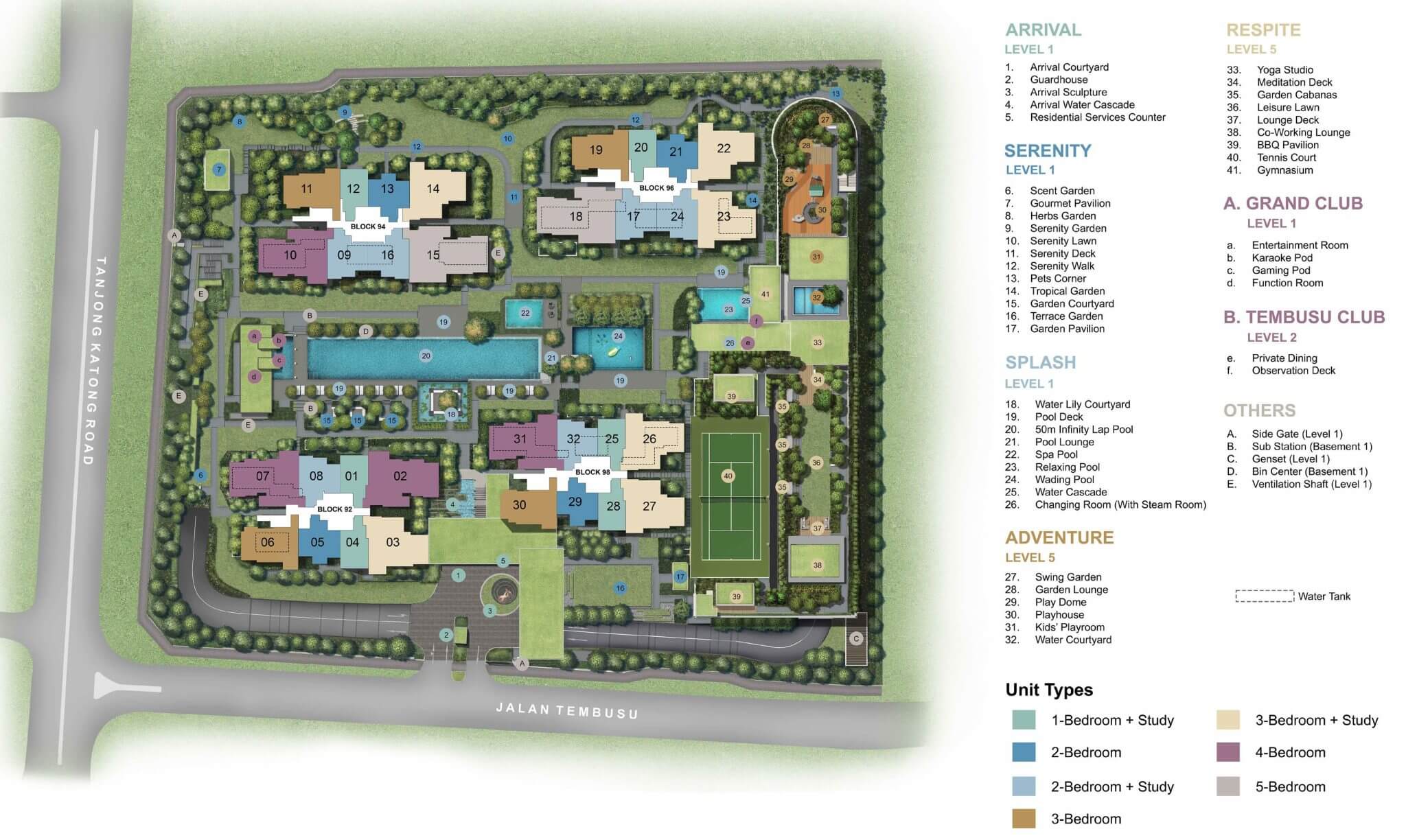 Arrival Courtyard, Guardhouse, Arrival Sculpture, Arrival Water Cascade, Residential Services Counter, Scent Garden, Gourmet Pavilion, Herbs Garden, Serenity Garden, Serenity Lawn, Serenity Deck, Serenity Walk, Pets Corner, Tropical Garden, Garden Courtyard, Terrace Garden, Garden Pavilion, Water Lily Courtyard, Pool Deck, 50m Infinity Lap Pool, Pool Lounge, Spa Pool, Relaxing Pool, Wading Pool, Water Cascade, Changing Room (with steam room), Swing Garden, Garden Lounge, Play Dome, Playhouse, Kids’ Playroom, Water Courtyard, Yoga Studio, Meditation Deck, Garden Cabana, Leisure Lawn, Lounge Deck, Co-Working Lounge, BBQ Pavilion, Tennis Court, Gymnasium, Entertainment Room, Karaoke Pod, Gaming Pod, Function Room, Private Dining, Observation Deck, Side Gate (Level 1)