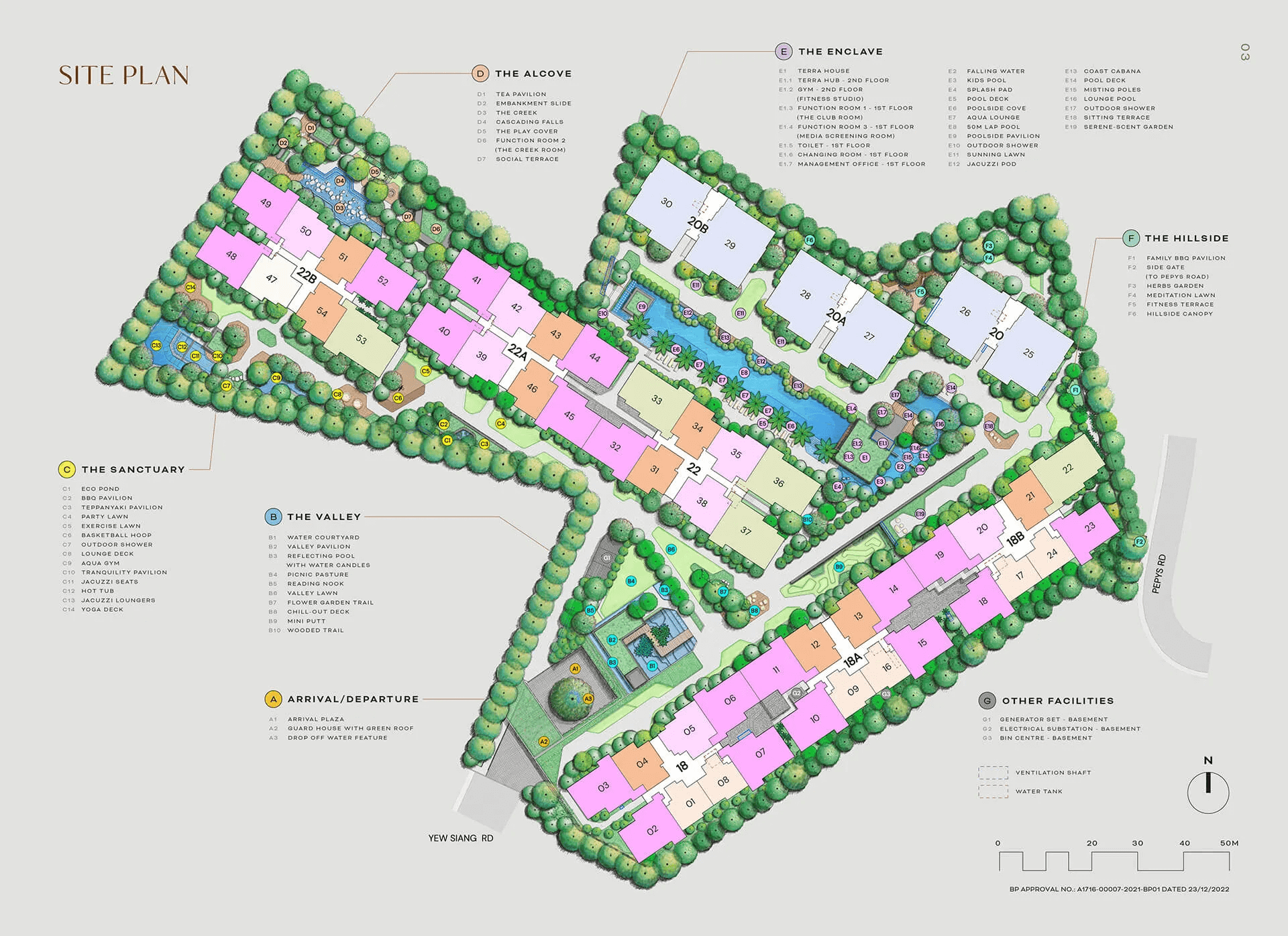 Arrival Plaza, Guard House with Green Roof, Drop-off with Water Feature, Water Courtyard, Valley Pavilion, Reflecting Pool with Water Candles, Picnic Pasture, Reading Nook, Valley Lawn, Flower Garden Trail, Chill-out Deck, Mini Put, Wooded Trail, Eco Pond, BBQ Pavilion, Teppanyaki Pavilion, Early Lawn, Exercise Lawn, Basketball Hoop, Outdoor Shower, Lounge Deck, Aqua Gym, Tranquility Pavilion, Jacuzzi Seats, Hot Tub, Jacuzzi Loungers, Yoga Deck, Tea Pavilion, Embankment Slide, The Creek, Cascading Falls, The Play Cove, Function Room (Creek Room), Social Terrace, Terra House, Terra Hub (Gym & Fitness Studio), Club Room, Media Screening Room, 50m Lap Pool, Pool Deck, Aqua Lounge, Poolside Pavilion, Kids Pool, Wading Pool, Pedal Pad, Kids Cove, Poolside Cove, Outdoor Shower, Sunken Lounge, Jacuzzi Pod, Coast Cabana, Mist Pool, Viewing Pods, Lounge Pod, Sitting Terrace, Serenity Garden, Family BBQ Pavilion, Herbs Garden, Meditation Lawn, Fitness Terrace, Hillside Canopy, Side Gate to Pepys Road, Generator Set (Basement), Electrical Substation (Basement), Bin Centre (Basement)
