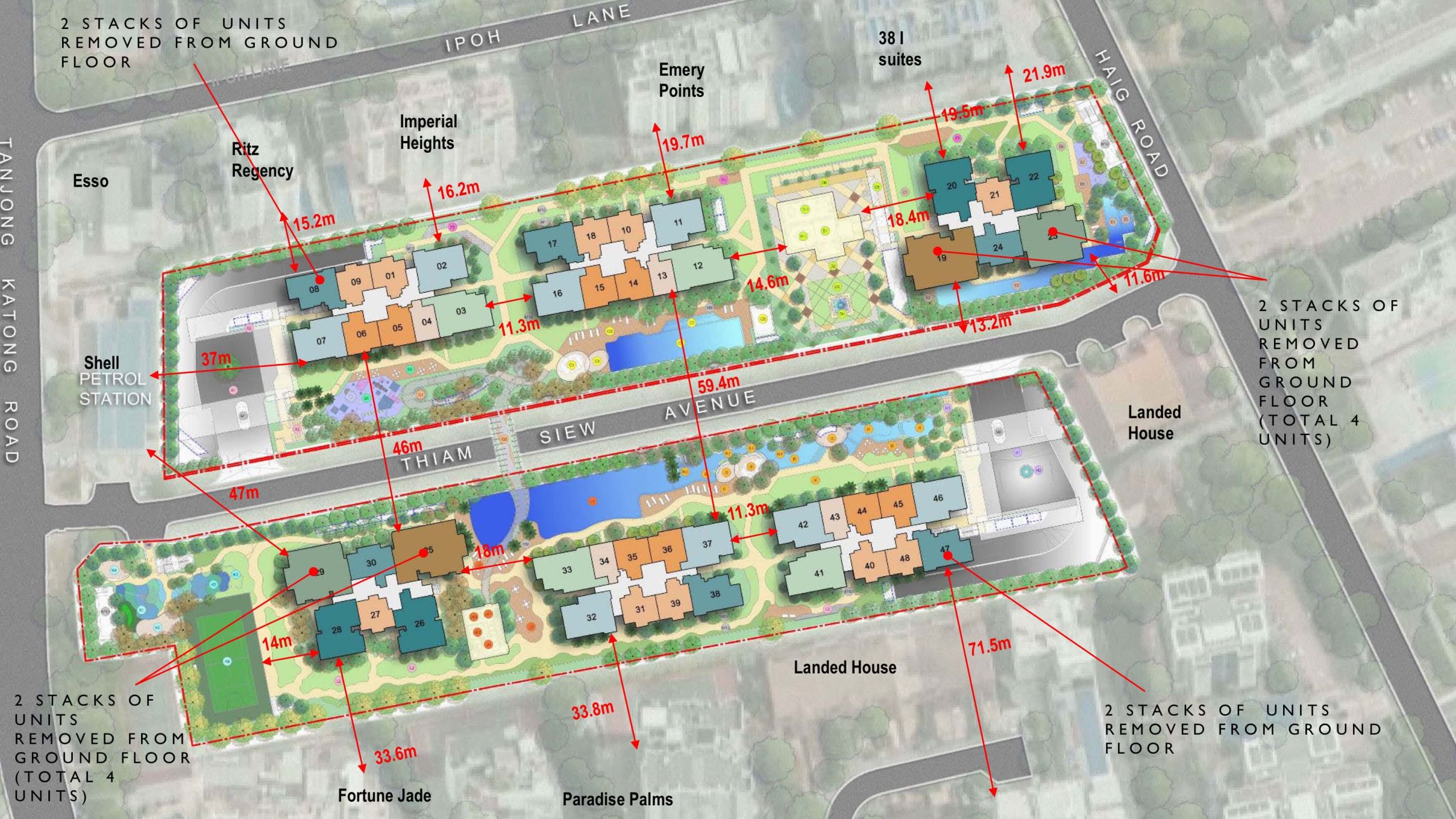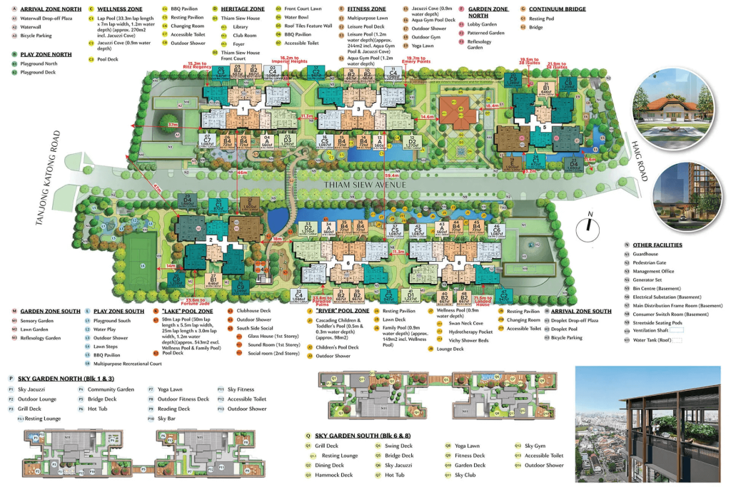 Sky Jacuzzi, Outdoor Lounge, Grill Deck, Resting Lounge, Community Garden, Bridge Deck, Hot Tub, Yoga Lawn, Outdoor Fitness Deck, Reading Deck, Sky Bar, Sky Fitness, Accessible Toilet, Outdoor Shower, Grill Deck (South), Resting Lounge (South), Dining Deck, Hammock Deck, Swing Deck, Bridge Deck (South), Sky Jacuzzi (South), Hot Tub (South), Yoga Lawn (South), Fitness Deck, Garden Deck, Sky Club, Sky Gym, Accessible Toilet (South), Outdoor Shower (South), Waterfall Drop-Off Plaza, Waterwall, Bicycle Parking, Playground North, Playground Deck, Lobby Garden, Patterned Garden, Reflexology Garden, Lap Pool (33.3m), Jacuzzi Cove, Pool Deck, BBQ Pavilion, Resting Pavilion, Changing Room, Accessible Toilet (North), Outdoor Shower (North), Resting Pod, Bridge (North), Club Room, Foyer, Heritage Lawn, Front Court Lawn, Theater Bowl, Art Tiles Feature Wall, Pavilion, Accessible Toilet (Heritage), Multipurpose Lawn, Leisure Pool Deck, Aqua Gym Pool, Jacuzzi Cove (1.2m), Aqua Gym Pool Deck, Outdoor Shower (Fitness), Outdoor Gym, Yoga Lawn (Fitness), Droplet Drop-Off Plaza, Droplet Pool, Playground South, Water Play, Outdoor Shower (South), Lawn Steps, BBQ Pavilion (South), Multipurpose Recreational Court, Sensory Garden, Lawn Garden, Reflexology Garden (South), Cascading Children & Toddler’s Pool, Children’s Pool Deck, Outdoor Shower, Resting Pavilion (River), Lawn Deck, Family Pool, Wellness Pool, Swan Neck Cove, Hydrotherapy Pocket, Vichy Shower Beds, Lounge Deck, Resting Pavilion (Lake), Changing Room (Lake), Accessible Toilet (Lake), 50m Lap Pool, Pool Deck (Lake), Clubhouse Deck, Outdoor Shower (Lake), South Side Social, Glass House, Sound Room, Social Room (2nd Storey), Guardhouse, Pedestrian Gate, Management Office, Generator Set, Bin Centre (Basement), Electrical Substation (Basement), Main Distribution Frame Room (Basement), Consumer Switch Room (Basement), Streetside Seating Pods, Ventilation Shaft, Water Tank (Roof)