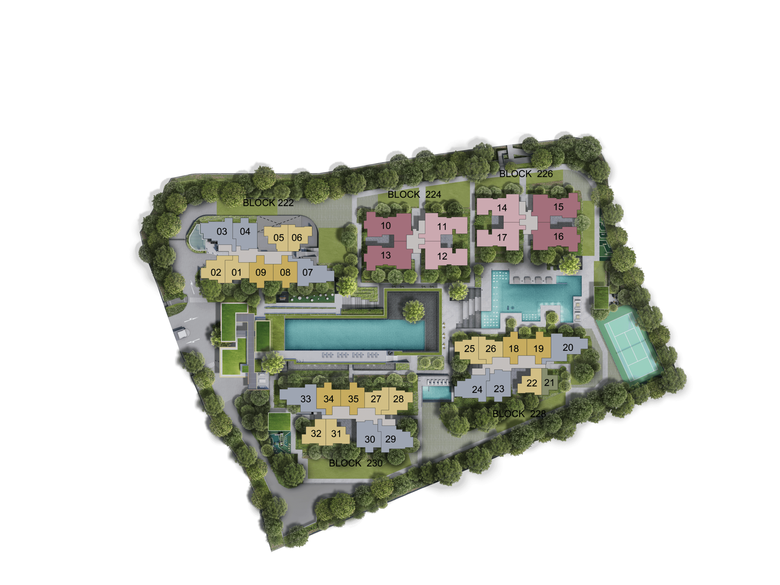 Childcare Centre, Drop Off Foyer, Side Gate 1, Side Gate 2, Side Gate 3, Guardhouse, Bicycle Parking and Repair Station, Management Office, Bulk Meter, Genset, Bin Centre, Substation, Serenity Waters, Play Lawn, Tai Chi Lawn, Tree Courtyard, Terracing Water Feature, Bubble Pool, Aqua Gym, Family Pool, Spa Bed, Spa Seat, Hydro Pool, Family Lounge, Pool Shower, Children’s Pool, Play Pavilion, Children’s Playground, Clubhouse, Reading Lounge, Gathering Lounge, Relaxation Lounge, Forest Fitness, BBQ Pavilion, Open Deck, Recreational Tennis Court, Water Sculpture, Picnic Lawn, Water Feature, 50m Lap Pool, Main Pool Deck, Pool Shower, Serenity Lounge, Gym, Hot & Cold Bath, Toilet with Steam Room, Accessible Toilet, Pilates Pavilion, Meditation Deck, Yoga Lawn, Floral Garden, Sensory Garden, Hammock Alcove, Maze Garden, Chess Garden, Community Garden, Sky Bar Pavilion, Sky Lounge, Hangout Lounge, Sky Deck, Water Tank, Solar Panel